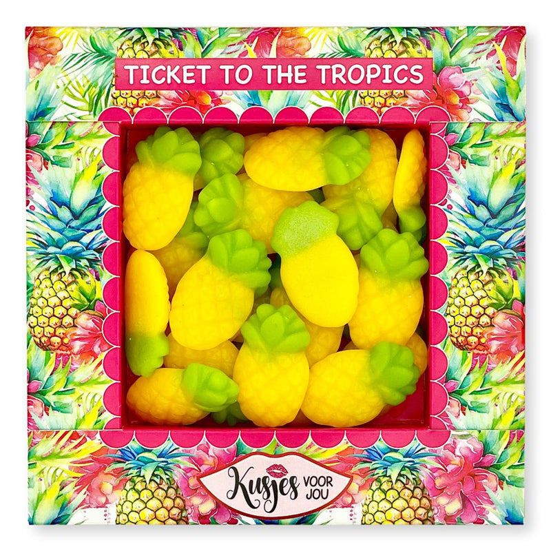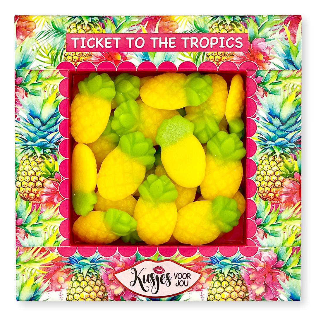 Snoep cadeaubox ananassen met tekst 'Ticket to the tropics'.