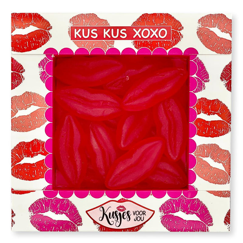 Snoep cadeaubox lippen met tekst 'Kus kus xoxo'.