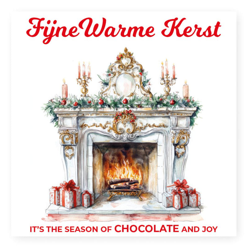 Chocolade reep tablet in kaart doosje met tekst 'Fijne Warme Kerst'.