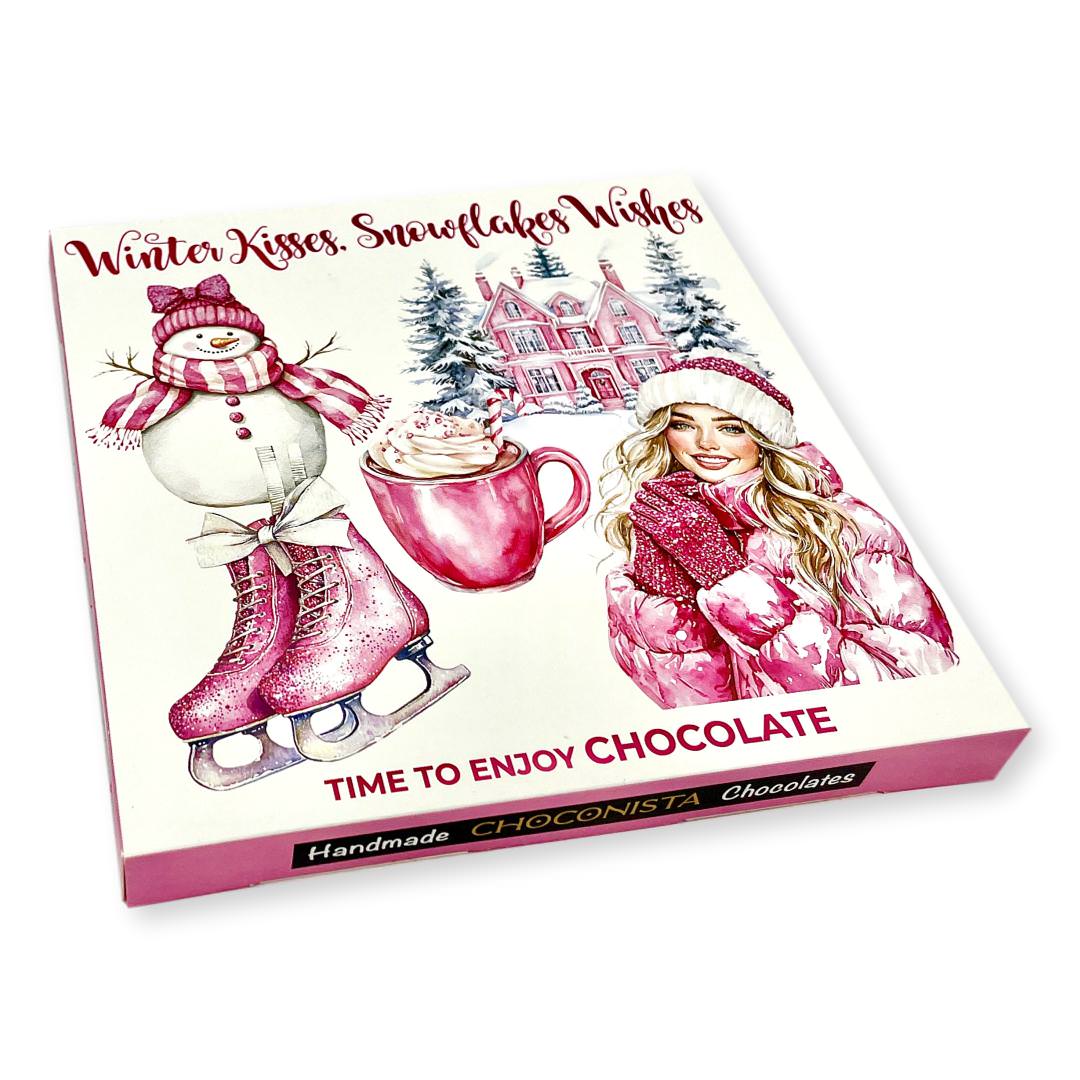 Chocolade reep tablet in kaart doosje met tekst 'Winter Kisses, Snowflakes Wishes'.