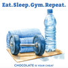 Chocolade reep tablet in kaart doosje met tekst 'Eat. Sleep. Gym. Repeat.'.
