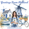 Chocolade reep tablet in kaart doosje met tekst 'Greetings from Holland'.