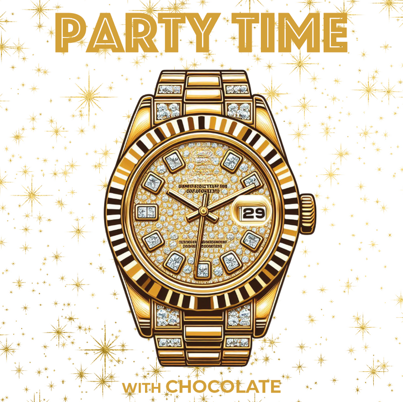 Chocolade reep tablet in kaart doosje met tekst 'Party Time'.