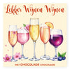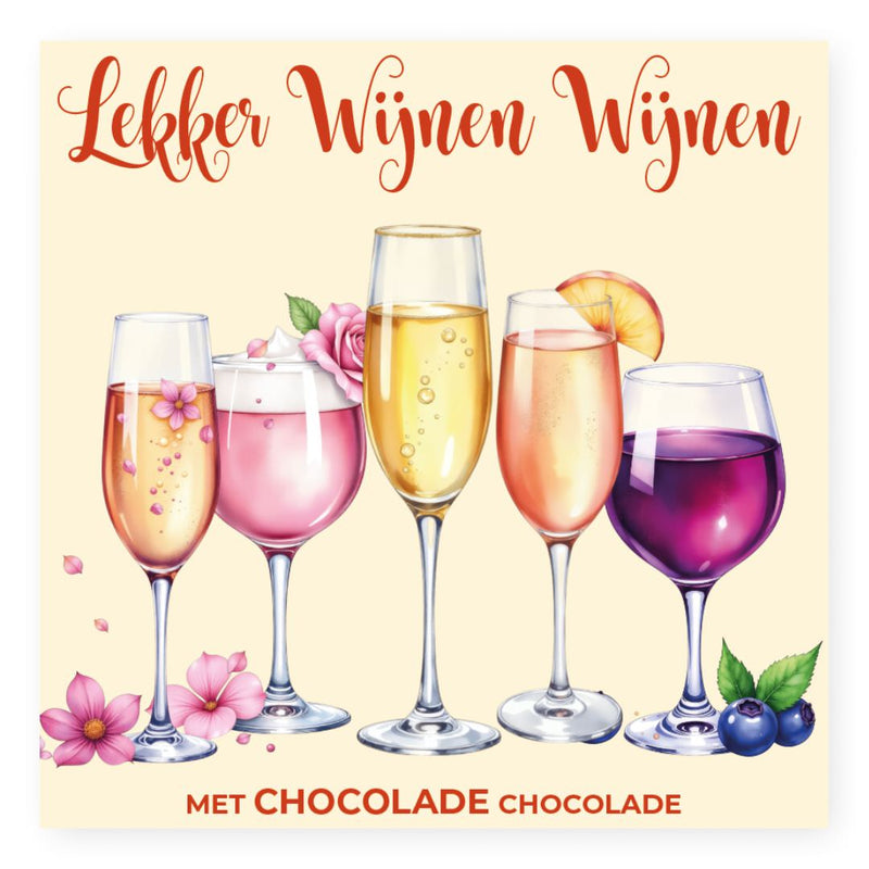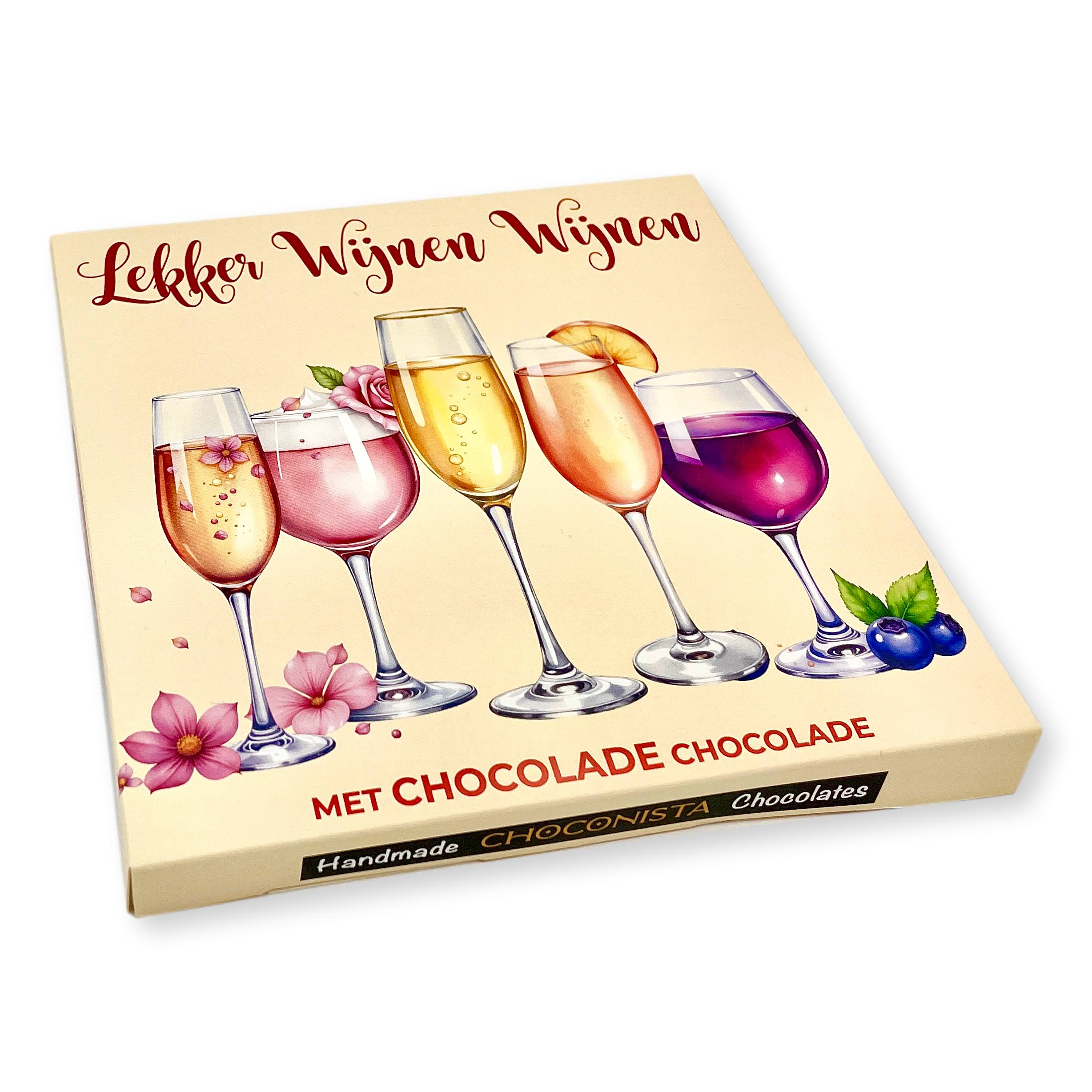 Chocolade reep tablet in kaart doosje met tekst 'Lekker Wijnen Wijnen'.