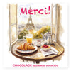 Chocolade reep tablet in kaart doosje met tekst 'Merci!'.