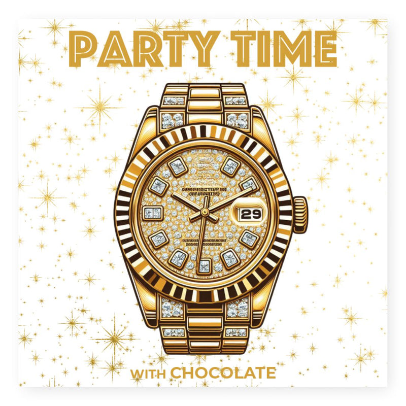 Chocolade reep tablet in kaart doosje met tekst 'Party Time'.