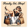 Chocolade reep tablet in kaart doosje met tekst 'Ready, Set, Shop!'.