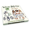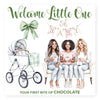 Chocolade reep tablet in kaart doosje met tekst 'Welcome Little One'.
