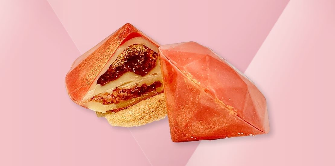 Pink Star Diamond is Bosbessen Cake met Frambozen, Aardbeien, Zwarte bessen Cream Cheese en Gouden Glitters verpakt in Belgische Chocolade.