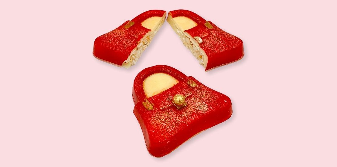 Coconut Chanel Handbag is Kokos Makronen, romige Kokos Crème en geroosterde Kokos verpakt in Belgische Chocolade.